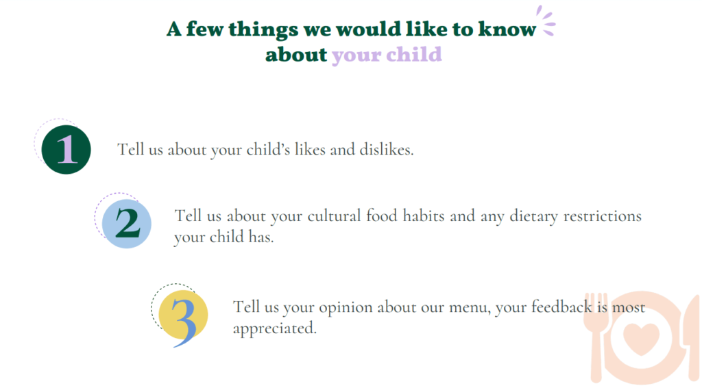 Our menu was developed by a Nutritional Therapist from an award-winning College of Naturopathic Medicine (CNM), and will be updated frequently so children do not get tired of the same food. Weekly menu is always displayed in our center, you can also request it from the management through an email.